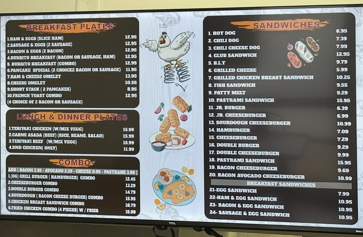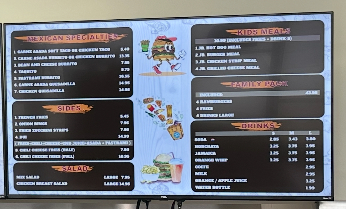 If you’re in the mood for something light, the Salads-such as the Chicken Breast Salad or the Large Mixed Salad-offer a refreshing, healthy option. And for fans of Mexican cuisine, the menu doesn’t disappoint, with choices like Carne Asada Plates, Asada Quesadillas, and Beef Taquitos.