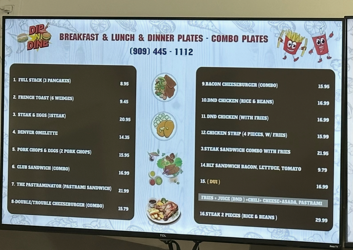 Dip N Dine's dinner menu is perfect for those who want a hearty, filling meal. Whether you’re in the mood for a Fried Chicken Dinner, Teriyaki Beef, or Teriyaki Chicken, each dish offers a satisfying combination of flavors. The Steak is another favorite for those who enjoy a well-cooked, flavorful cut of meat.
