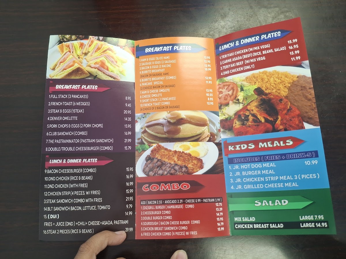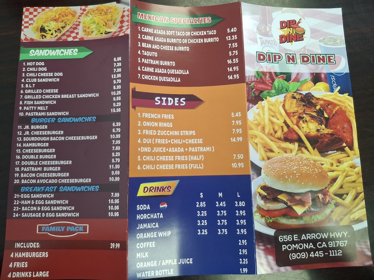 The Dip N Dine Menu offers a satisfying blend of comfort food favorites that appeal to a wide range of tastes. Whether you're in the mood for a juicy burger, savory breakfast, or a satisfying dinner, there's something for everyone. For burger lovers, the menu features standouts like the SourD Bacon Cheese Burger and Pastrami Burger, perfect for those craving a rich, meaty experience. If you prefer hot dogs, the Chili Cheese Dog and Chili Dog are great choices, loaded with flavor. For sides, you can't go wrong with the Chili Cheese Fries, especially the full order, which is piled high with melty cheese and hearty chili.